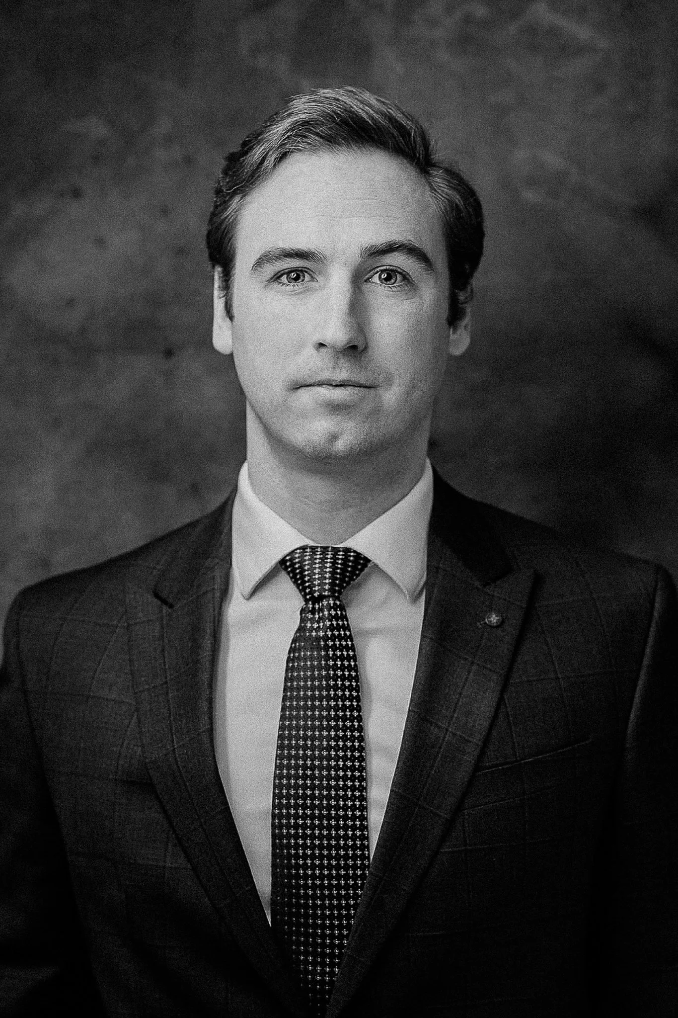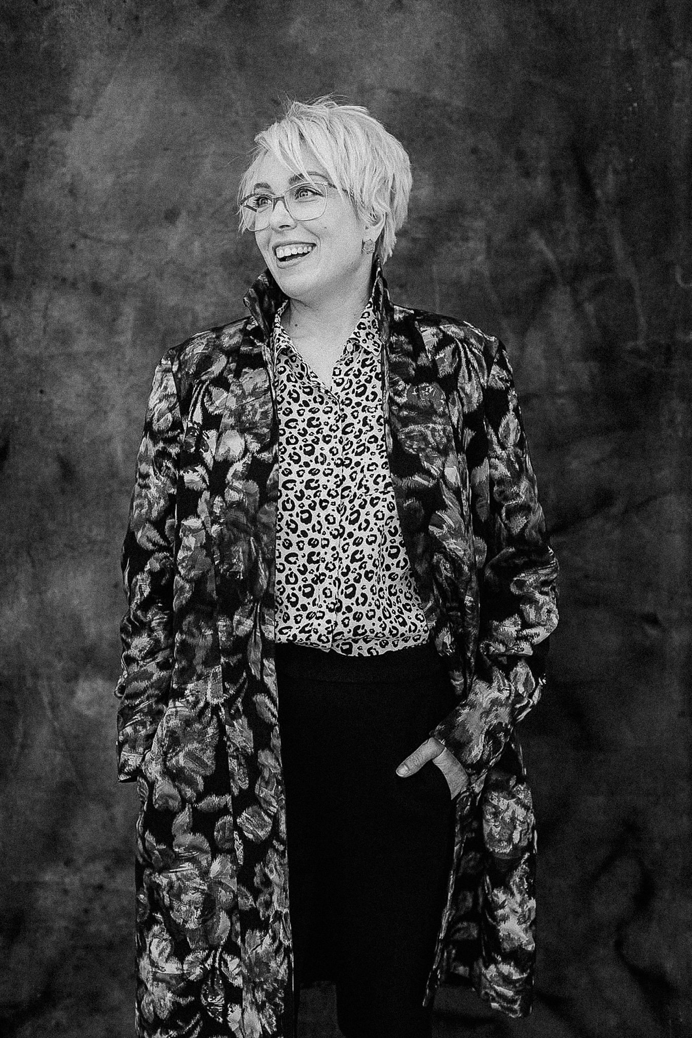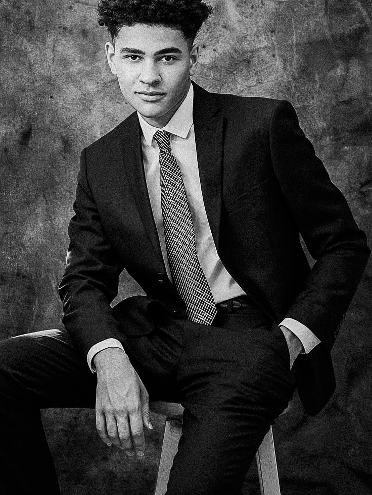 Black & white portrait on a painted backdrop